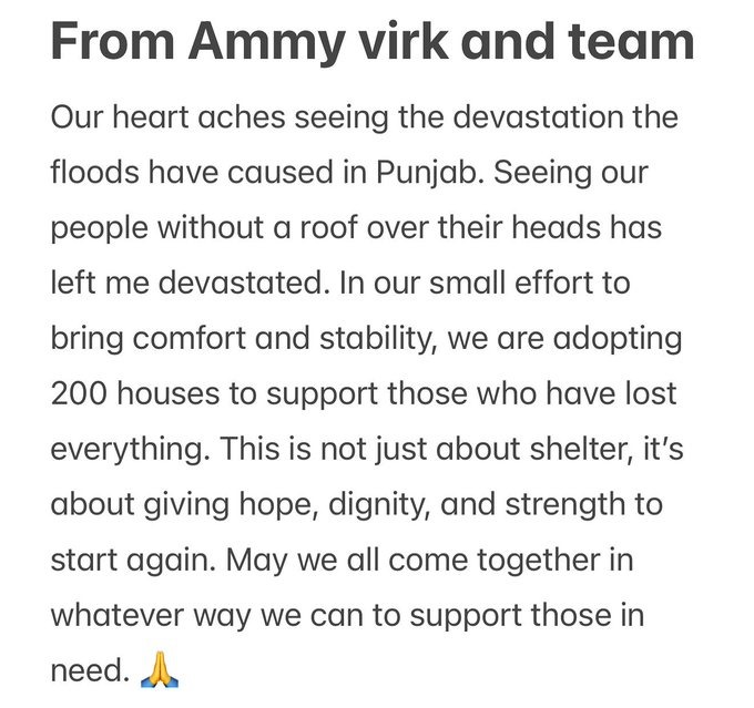 ਐਮੀ ਵਿਰਕ ਨੇ ਕਿਹਾ ਕਿ ਮੁਸੀਬਤ ਦੇ ਸਮੇਂ ਲੋਕਾਂ ਦਾ ਸਾਥ ਦੇਣਾ ਹੀ ਸੱਚੀ ਇਨਸਾਨੀਅਤ ਹੈ ਅਤੇ ਉਹ ਆਪਣੀ ਟੀਮ ਨਾਲ ਮਿਲ ਕੇ ਇਹ ਯਤਨ ਕਰ ਰਹੇ ਹਨ ਕਿ ਹੜ੍ਹ ਪੀੜਤ ਪਰਿਵਾਰਾਂ ਨੂੰ ਛੱਤ ਅਤੇ ਸੁਵਿਧਾਵਾਂ ਮੁਹੱਈਆ ਕਰਵਾਈਆਂ ਜਾਣ।