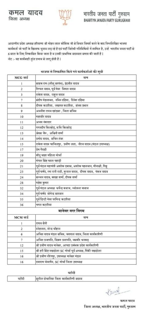 ਜਾਣਕਾਰੀ ਅਨੁਸਾਰ ਭਾਜਪਾ ਜ਼ਿਲ੍ਹਾ ਪ੍ਰਧਾਨ ਕਮਲ ਯਾਦਵ ਨੇ ਸੂਬਾ ਪ੍ਰਧਾਨ ਹਰਿਆਣਾ ਮੋਹਨ ਲਾਲ ਕੋਸ਼ਿਕ ਨੂੰ ਇੱਕ ਪੱਤਰ ਲਿਖਿਆ ਹੈ। ਜਿਸ ਵਿੱਚ ਉਨ੍ਹਾਂ ਕਿਹਾ ਕਿ ਭਾਜਪਾ ਵਰਕਰ ਜੋ ਪਾਰਟੀ ਵਿਰੁੱਧ ਚੋਣਾਂ ਲੜ ਰਹੇ ਹਨ ਅਤੇ ਪਾਰਟੀ ਵਿਰੋਧੀ ਗਤੀਵਿਧੀਆਂ ਵਿੱਚ ਸ਼ਾਮਲ ਹਨ, ਉਨ੍ਹਾਂ ਨੂੰ 6 ਸਾਲਾਂ ਲਈ ਭਾਜਪਾ ਵਿੱਚੋਂ ਕੱਢ ਦਿੱਤਾ ਜਾਂਦਾ ਹੈ ਅਤੇ ਉਨ੍ਹਾਂ ਦੀ ਮੁੱਢਲੀ ਮੈਂਬਰਸ਼ਿਪ ਖਤਮ ਕਰ ਦਿੱਤੀ ਜਾਂਦੀ ਹੈ।