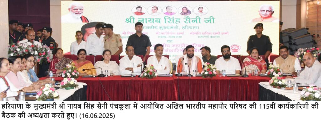 चंडीगढ़, 16 जून — हरियाणा के मुख्यमंत्री श्री नायब सिंह सैनी ने कहा कि महापौर अपने-अपने शहरों के प्रथम नागरिक होने के साथ-साथ वहां के विकास और प्रगति के प्रत्यक्ष सारथी भी हैं। उन्होंने कहा कि महापौर सरकार की नीतियों और योजनाओं को धरातल पर उतारते हैं, नागरिकों की आकांक्षाओं को समझते हैं और उनकी समस्याओं का समाधान करते हैं। स्थानीय स्वशासन की परिकल्पना में महापौर रीढ़ के समान हैं। मुख्यमंत्री श्री सैनी आज पंचकूला में आयोजित अखिल भारतीय महापौर कार्यकारी परिषद की 115वीं बैठक को संबोधित कर रहे थे।