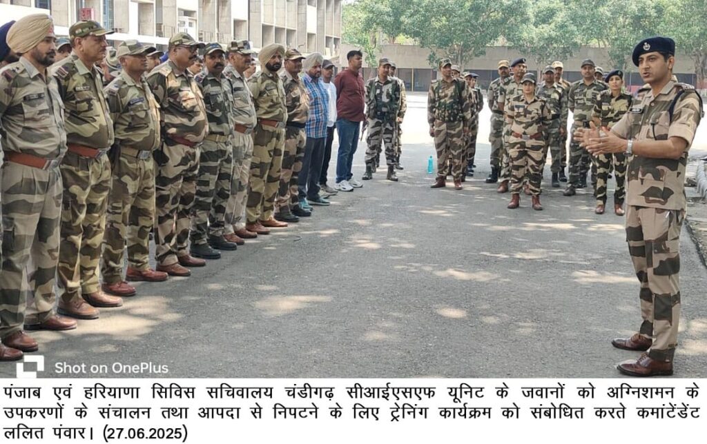 चंडीगढ़, 27 जून — पंजाब एवं हरियाणा सिविल सचिवालय, चंडीगढ़ में तैनात केंद्रीय औद्योगिक सुरक्षा बल (CISF) ने आज अपने राष्ट्रव्यापी अग्नि परीक्षण अभियान के तहत एक विशेष अग्निशमन प्रशिक्षण कार्यक्रम का आयोजन किया। इस प्रशिक्षण में जवानों को आपदा की स्थिति में अग्निशमन उपकरणों के संचालन और आग पर काबू पाने की तकनीकें सिखाई गईं।
