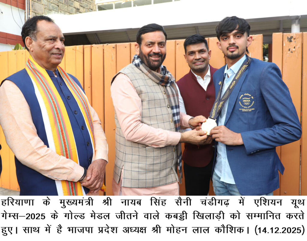 चंडीगढ़, 14 दिसंबर — हरियाणा के मुख्यमंत्री श्री नायब सिंह सैनी ने आज बहरीन में आयोजित एशियन यूथ गेम्स-2025 में स्वर्ण पदक जीतने वाली लड़के एवं लड़कियों की भारतीय कबड्डी टीमों के सदस्य रहे हरियाणा के खिलाड़ियों के एक प्रतिनिधिमंडल को सम्मानित किया।