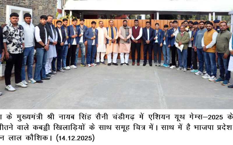 चंडीगढ़, 14 दिसंबर — हरियाणा के मुख्यमंत्री श्री नायब सिंह सैनी ने आज बहरीन में आयोजित एशियन यूथ गेम्स-2025 में स्वर्ण पदक जीतने वाली लड़के एवं लड़कियों की भारतीय कबड्डी टीमों के सदस्य रहे हरियाणा के खिलाड़ियों के एक प्रतिनिधिमंडल को सम्मानित किया।