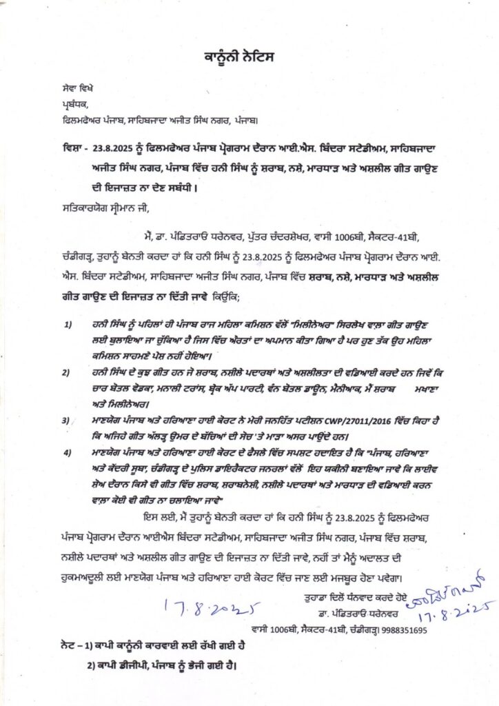 ਡਾ. ਧਰੇਨਬਰ ਨੇ ਆਪਣੇ ਨੋਟਿਸ ਵਿੱਚ ਲਿਖਿਆ ਹੈ ਕਿ ਹਨੀ ਸਿੰਘ ਪਹਿਲਾਂ ਵੀ ਆਪਣੇ ਗੀਤਾਂ ਰਾਹੀਂ ਨੌਜਵਾਨਾਂ ਵਿੱਚ ਨਸ਼ੇ ਅਤੇ ਅਸ਼ਲੀਲਤਾ ਨੂੰ ਪ੍ਰਮੋਟ ਕਰ ਚੁੱਕੇ ਹਨ। ਉਨ੍ਹਾਂ ਨੇ ਦਲੀਲ ਦਿੱਤੀ ਕਿ ਇਸ ਤਰ੍ਹਾਂ ਦੇ ਗੀਤਾਂ ਨਾਲ ਨੌਜਵਾਨ ਪੀੜ੍ਹੀ ਗਲਤ ਰਾਹ ‘ਤੇ ਜਾਂਦੀ ਹੈ ਅਤੇ ਸਮਾਜ ‘ਚ ਬੁਰੇ ਅਸਰ ਪੈਂਦੇ ਹਨ।ਨੋਟਿਸ ਵਿੱਚ ਇਹ ਵੀ ਕਿਹਾ ਗਿਆ ਹੈ ਕਿ ਪੰਜਾਬ ਸਟੇਟ ਵੁਮੈਨ ਕਮਿਸ਼ਨ ਵੱਲੋਂ ਵੀ ਹਨੀ ਸਿੰਘ ਨੂੰ ਪਹਿਲਾਂ ਹੀ ਔਰਤਾਂ ਖਿਲਾਫ਼ ਅਪਮਾਨਜਨਕ ਸ਼ਬਦਾਵਲੀ ਦੇ ਇਸਤੇਮਾਲ ‘ਤੇ ਨੋਟਿਸ ਕੀਤਾ ਗਿਆ ਸੀ। ਇਸ ਲਈ, ਜੇ ਉਹਨਾਂ ਨੂੰ ਅਜਿਹੇ ਗੀਤ ਗਾਉਣ ਦੀ ਮਨਜ਼ੂਰੀ ਦਿੱਤੀ ਜਾਂਦੀ ਹੈ ਤਾਂ ਇਹ ਨਾ ਸਿਰਫ਼ ਕਾਨੂੰਨ ਦੀ ਉਲੰਘਣਾ ਹੋਵੇਗੀ ਬਲਕਿ ਸਮਾਜ ਲਈ ਵੀ ਘਾਤਕ ਸਾਬਤ ਹੋਵਗਾ ਹੈ।ਡਾ. ਧਰੇਨਬਰ ਨੇ ਸਪੱਸ਼ਟ ਕੀਤਾ ਹੈ ਕਿ ਜੇਕਰ 23 ਅਗਸਤ 2025 ਨੂੰ ਮੋਹਾਲੀ ਵਿੱਚ ਹੋਣ ਵਾਲੇ ਇਸ ਸਮਾਗਮ ਵਿੱਚ ਅਸ਼ਲੀਲ ਤੇ ਨਸ਼ੇ ਨੂੰ ਪ੍ਰਮੋਟ ਕਰਨ ਵਾਲੇ ਗੀਤ ਗਾਏ ਜਾਂਦੇ ਹਨ ਤਾਂ ਇਸ ਖਿਲਾਫ਼ ਕਾਨੂੰਨੀ ਕਾਰਵਾਈ ਕੀਤੀ ਜਾਵੇਗੀ।