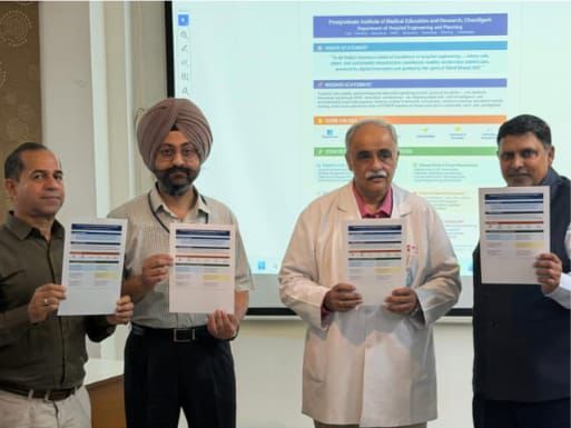 पहले दो प्रशिक्षण कार्यक्रमों के दौरान, इंजीनियरिंग अधिकारियों ने व्यापक समूह कार्य के माध्यम से विज़न और मिशन स्टेटमेंट विकसित किए थे, जिन्हें बाद में विज़न, मिशन, कोर वैल्यूज़ और स्ट्रैटेजिक पिलर्स के एक व्यापक ढाँचे में समेकित किया गया। इस समेकित पोस्टर का औपचारिक विमोचन PGIMER के माननीय निदेशक डॉ. विवेक लाल द्वारा तीसरे प्रशिक्षण सत्र के दौरान किया गया। यह ढाँचा अस्पताल इंजीनियरिंग, प्लानिंग और आर्किटेक्चर विभाग की गतिविधियों को विकसित भारत 2047 की राष्ट्रीय दृष्टि के अनुरूप दिशा देने की अपेक्षा रखता है।