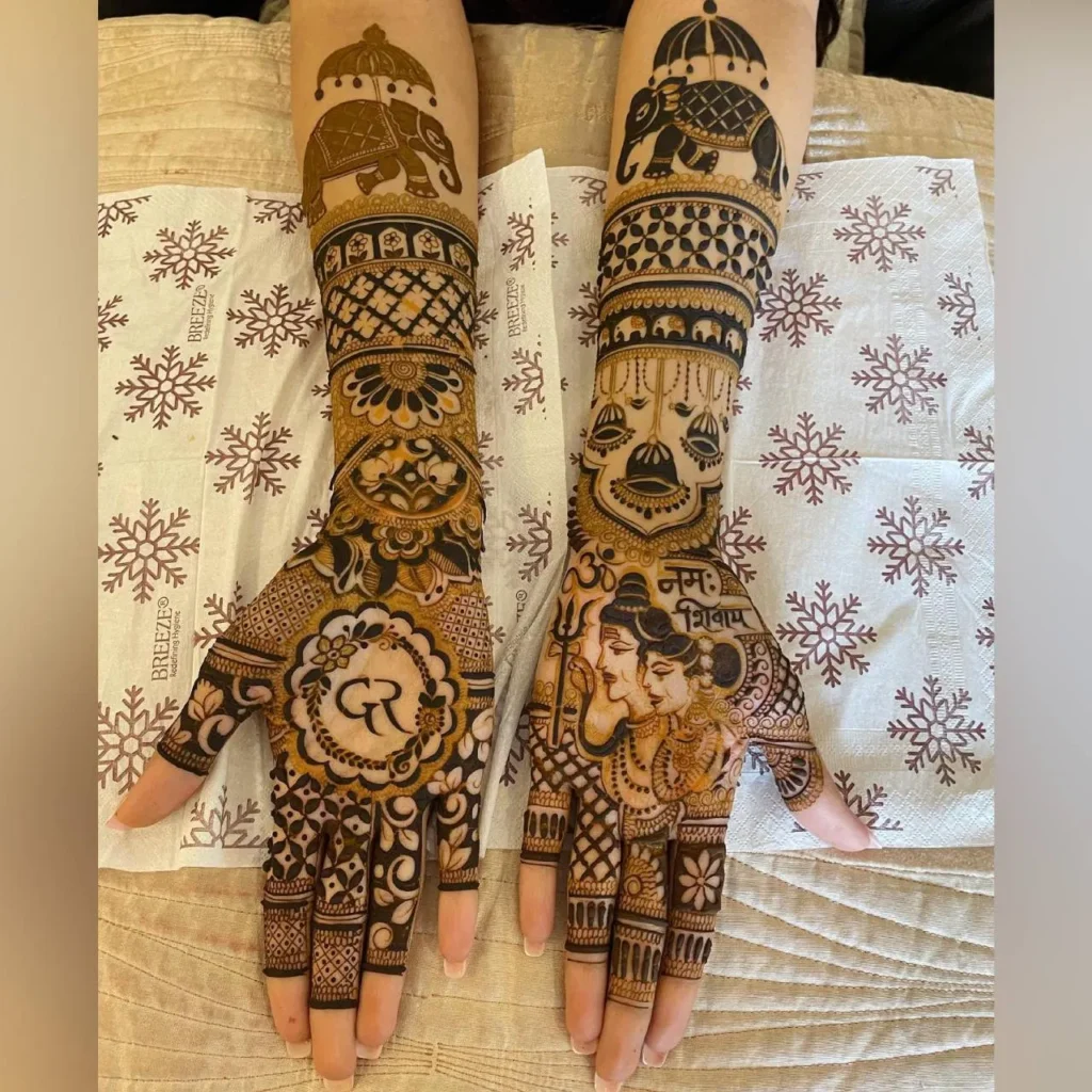 ਇਸ ਡਿਜ਼ਾਈਨ ਵਿੱਚ ਇੱਕ ਹੱਥ ਵਿੱਚ ਮਾਤਾ ਰਾਣੀ ਦੀ ਤਸਵੀਰ ਅਤੇ ਦੂਜੇ ਪਾਸੇ ਇੱਕ ਬਾਲ ਸ਼ਿਵ ਹੈ। ਕਮਲ, ਮੰਦਰ ਅਤੇ “ਕੇਦਾਰਨਾਥ” ਸ਼ਬਦ ਦੇ ਨਾਲ-ਨਾਲ ਕਲਾਈ ‘ਤੇ ਤ੍ਰਿਸ਼ੂਲ ਅਤੇ ਡਮਰੂ ਵੀ ਉੱਕਰੇ ਹੋਏ ਹਨ। ਇਹ ਮਹਿੰਦੀ ਬਹੁਤ ਅਧਿਆਤਮਿਕ ਅਤੇ ਸੁੰਦਰ ਦਿਖਾਈ ਦਿੰਦੀ ਹੈ। (ਕ੍ਰੈਡਿਟ: hiral_hiren_dixit_)