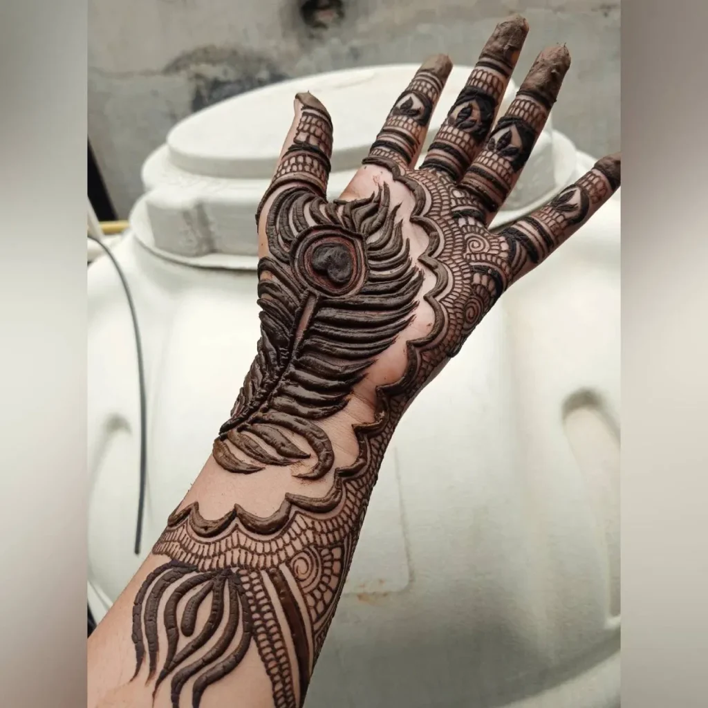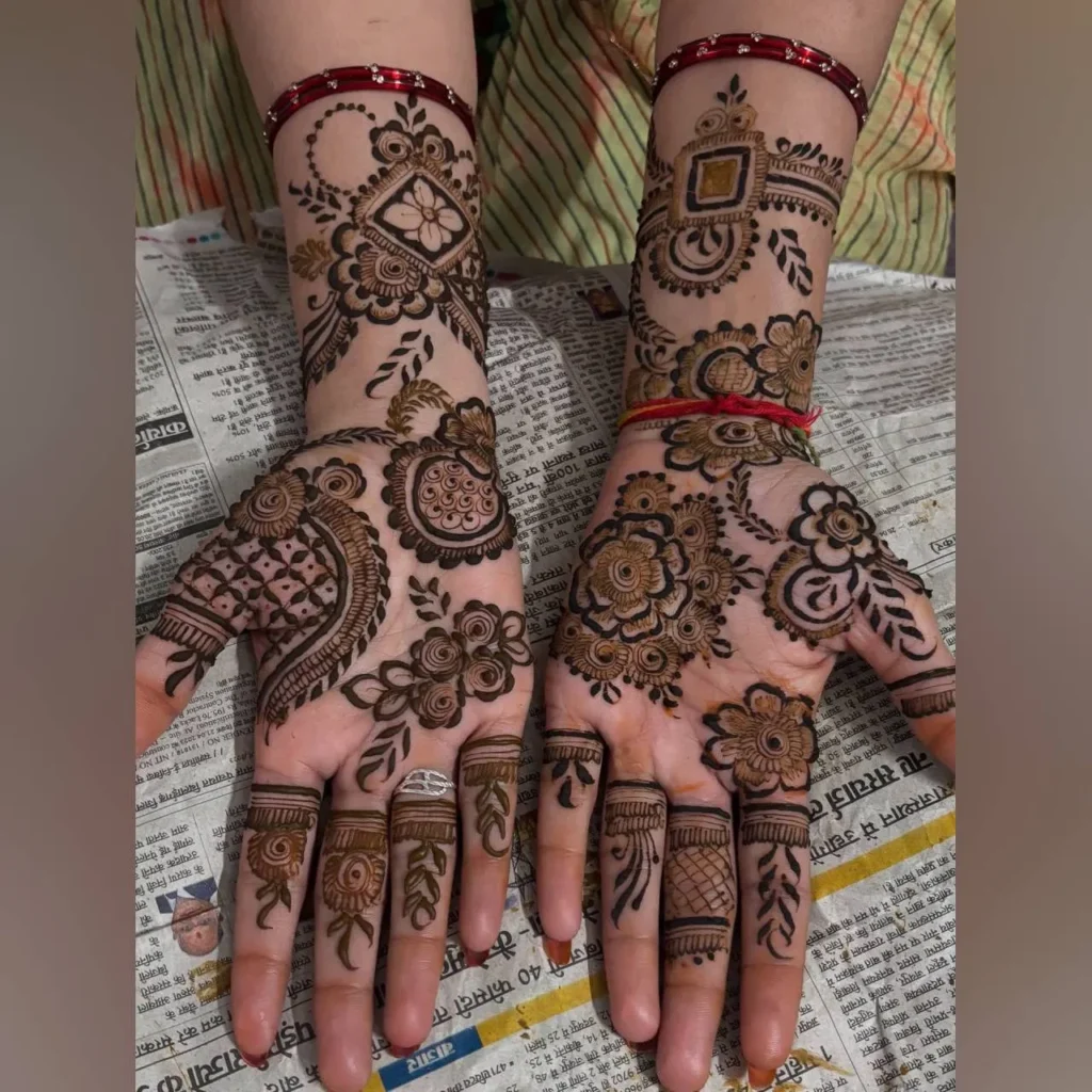 ਉਨ੍ਹਾਂ ਲਈ ਜੋ ਇੱਕ ਵਿਲੱਖਣ ਦਿੱਖ ਚਾਹੁੰਦੇ ਹਨ, ਇੱਕ ਡਿਜ਼ਾਈਨ ਜਿਸ ਵਿੱਚ ਇੱਕ ਔਰਤ ਇੱਕ ਹੱਥ ਵਿੱਚ ਝੂਲਦੀ ਹੈ ਅਤੇ ਦੂਜੇ ਪਾਸੇ ਇੱਕ ਮੋਰ ਹੈ, ਬਹੁਤ ਵਧੀਆ ਹੋਵੇਗਾ। ਇਹ ਪੈਟਰਨ ਤਿਉਹਾਰ ਦੀ ਭਾਵਨਾ ਦੇ ਨਾਲ-ਨਾਲ ਸੁੰਦਰਤਾ ਨੂੰ ਵੀ ਵਧਾਉਂਦਾ ਹੈ। (ਕ੍ਰੈਡਿਟ: farzana_anjali_mehndi)
