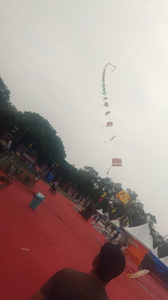 ਦਿਨ ਭਰ ਹੋਈ ਬਾਰਿਸ਼ ਕਾਰਨ ਪਤੰਗ ਉਡਾਉਣ ਦੇ ਮਾਹਿਰ ਤੌਸੀਫ ਨੂੰ ਕਾਫ਼ੀ ਸਮਾਂ ਇੰਤਜ਼ਾਰ ਕਰਨਾ ਪਿਆ, ਪਰ ਦੁਪਹਿਰ ਵੇਲੇ, ਪਰੇਡ ਗਰਾਊਂਡ ਦੀ ਬਜਾਏ, ਸਾਰਿਆਂ ਦੀਆਂ ਨਜ਼ਰਾਂ ਅਸਮਾਨ ਵੱਲ ਖਿੱਚੀਆਂ ਗਈਆਂ ਅਤੇ ਇੱਕ ਡੋਰੀ ‘ਤੇ 100 ਰੰਗ-ਬਿਰੰਗੇ ਪਤੰਗ: ਅਸਮਾਨ ਵਿੱਚ ਪਤੰਗਾਂ ਨਾਲ ਏਕਤਾ ਅਤੇ ਭਾਈਚਾਰੇ ਦਾ ਸੰਦੇਸ਼ ਦਿੱਤਾ ਗਿਆ। ਹਾਲਾਂਕਿ, ਤਿਉਹਾਰ ਦੌਰਾਨ ਦਿਨ ਭਰ ਕਾਰੀਗਰਾਂ ਅਤੇ ਕਲਾਕਾਰਾਂ ਦੁਆਰਾ ਲਾਈਵ ਪ੍ਰਦਰਸ਼ਨ ਜਾਰੀ ਰਹੇ, ਦਰਸ਼ਕਾਂ ਨੂੰ ਰਵਾਇਤੀ ਕਲਾ ਅਤੇ ਸੱਭਿਆਚਾਰ ਨਾਲ ਜੋੜਦੇ ਹੋਏ।