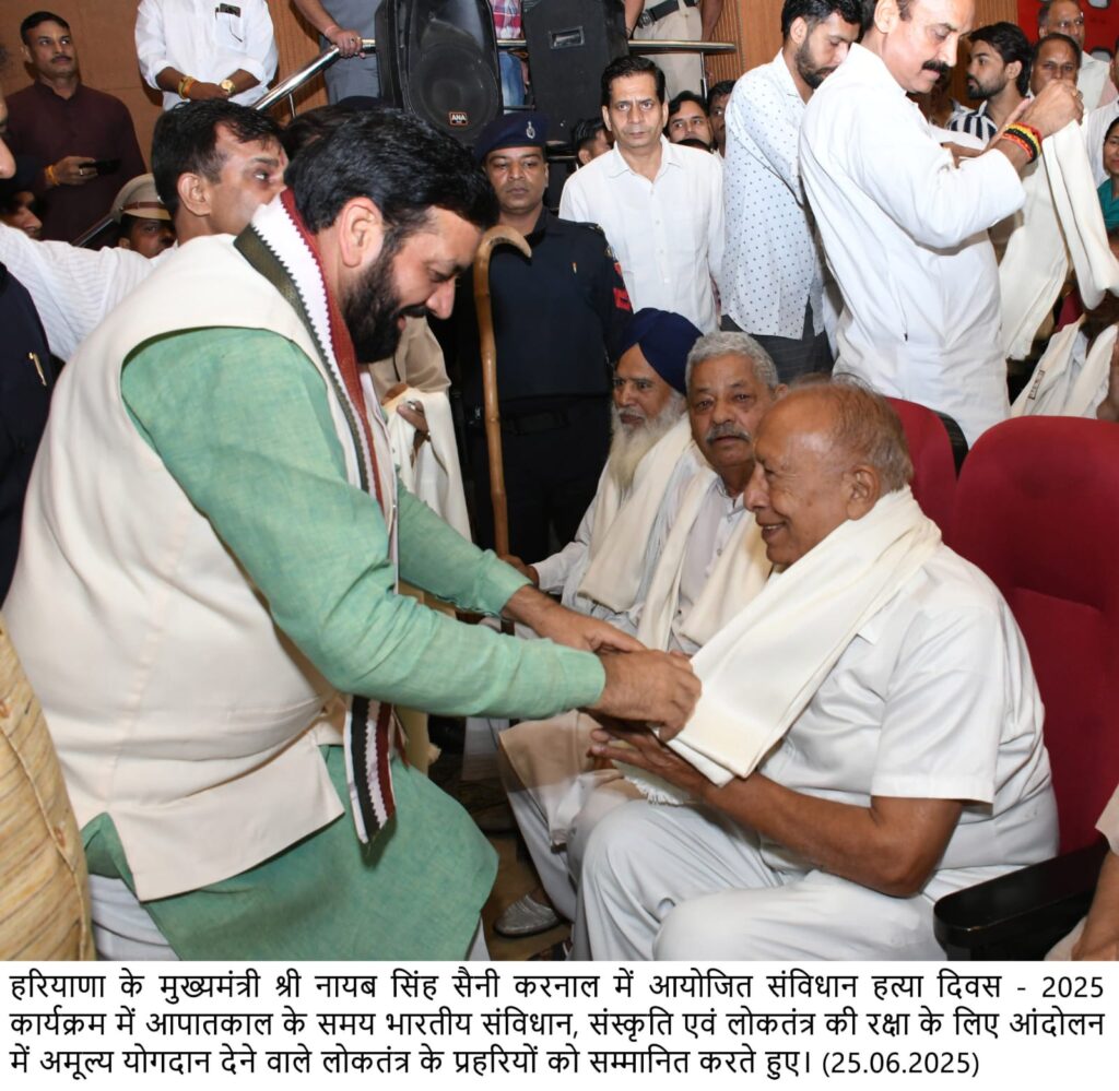 चंडीगढ़, 25 जून – आपातकाल की 50वीं वर्षगांठ पर आयोजित ‘संविधान हत्या दिवस’ कार्यक्रम में हरियाणा के मुख्यमंत्री श्री नायब सिंह सैनी ने कांग्रेस पार्टी पर तीखा हमला बोलते हुए कहा कि संविधान तोड़ना कांग्रेस के डीएनए में शामिल है, और आज भी कांग्रेस संविधान को कुचलने का प्रयास कर रही है। उन्होंने कहा कि प्रधानमंत्री नरेंद्र मोदी के नेतृत्व में देश पिछले 11 वर्षों से संविधान के अनुरूप चला है, और असल मायनों में आजाद भारत का सही अर्थ लोगों ने 2014 के बाद देखा है।