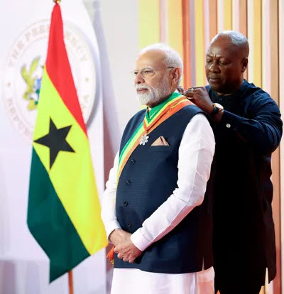 ਨੈਸ਼ਨਲ ਟਾਈਮਜ਼ ਬਿਊਰੋ :- ਪ੍ਰਧਾਨ ਮੰਤਰੀ ਨਰਿੰਦਰ ਮੋਦੀ ਨੂੰ ਉਨ੍ਹਾਂ ਦੇ ‘ਉੱਤਮ ਸ਼ਾਸਨ ਹੁੁਨਰ ਤੇ ਪ੍ਰਭਾਵਸ਼ਾਲੀ ਆਲਮੀ ਅਗਵਾਈ’ ਲਈ ਘਾਨਾ ਦੇ ਕੌਮੀ ਸਨਮਾਨ ‘ਆਫੀਸਰ ਆਫ਼ ਦ ਆਰਡਰ ਆਫ ਦਿ ਸਟਾਰ ਆਫ ਘਾਨਾ’ ਨਾਲ ਨਿਵਾਜਿਆ ਗਿਆ ਹੈ। ਇਸ ਦੌਰਾਨ ਦੋਵਾਂ ਮੁਲਕਾਂ ਨੇ ਦੁਵੱਲੇ ਰਿਸ਼ਤਿਆਂ ਦੀ ਮਜ਼ਬੂਤੀ ਲਈ ਚਾਰ ਸਮਝੌਤਿਆਂ ’ਤੇ ਦਸਤਖ਼ਤ ਕੀਤੇ ਹਨ। ਘਾਨਾ ਦੇ ਰਾਸ਼ਟਰਪਤੀ ਜੌਹਨ ਡਰਾਮਾਨੀ ਮਹਾਮਾ ਨੇ ਪ੍ਰਧਾਨ ਮੰਤਰੀ ਮੋਦੀ ਨੂੰ ਬੁੱਧਵਾਰ ਨੂੰ ਇਸ ਪੁਰਸਕਾਰ ਨਾਲ ਸਨਮਾਨਿਤ ਕੀਤਾ।