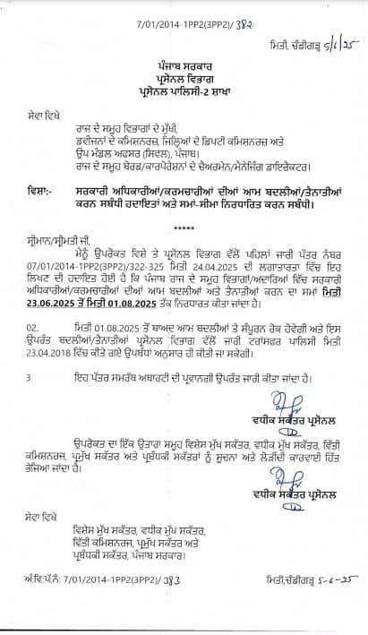 ਨੈਸ਼ਨਲ ਟਾਈਮਜ਼ ਬਿਊਰੋ :- ਪੰਜਾਬ ਸਰਕਾਰ ਨੇ ਸਰਕਾਰੀ ਅਧਿਕਾਰੀਆਂ ਅਤੇ ਕਰਮਚਾਰੀਆਂ ਲਈ ਨਵੇਂ ਹੁਕਮ ਜਾਰੀ ਕੀਤੇ ਹਨ। ਦਰਅਸਲ, ਸਰਕਾਰੀ ਅਧਿਕਾਰੀਆਂ ਅਤੇ ਕਰਮਚਾਰੀਆਂ ਦੇ ਆਮ ਤਬਾਦਲਿਆਂ ਅਤੇ ਨਿਯੁਕਤੀਆਂ ਨਾਲ ਸੰਬੰਧਤ ਨਵੇਂ ਹੁਕਮ ਜਾਰੀ ਹੋਏ ਹਨ। ਇਹਨਾਂ ਹੁਕਮਾਂ ਅਨੁਸਾਰ, ਆਮ ਤਬਾਦਲਿਆਂ ਅਤੇ ਨਿਯੁਕਤੀਆਂ ਦੀ ਮਿਆਦ 23 ਜੂਨ 2025 ਤੋਂ 1 ਅਗਸਤ 2025 ਤੱਕ ਨਿਰਧਾਰਤ ਕੀਤੀ ਗਈ ਹੈ।